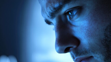 Young focused man doing overtime job watching computer at desktop in dark office.