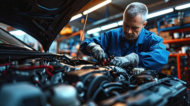 skilled auto mechanic, wearing a blue jumpsuit, intensely focused on repairing a complex car engine, in a well-lit, organized car repair shop