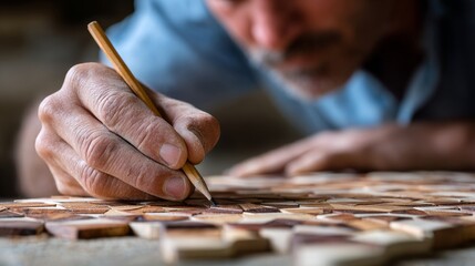Close-up of a craftsman meticulously working on a wooden mosaic with a pencil, focusing on intricate details