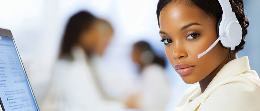 A friendly and focused call center operator helps customers using a headset in a bright office.
