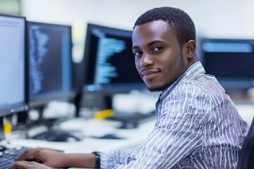 African Black Woman Soft Developer - programmer, woman, computer, coding, smile, office, lights, workspace, monitor, software, development, technology, portrait, professional