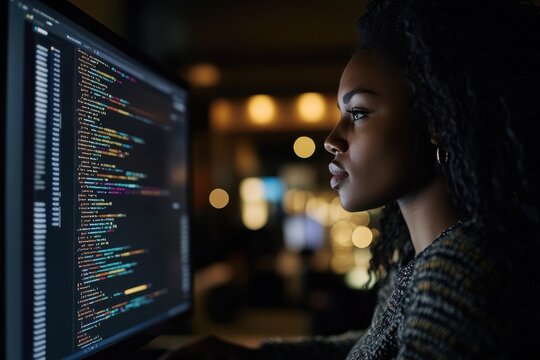 IT developer working late in a dark office, side view of a black woman coding on her computer