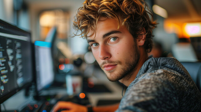 Young developer focused on laptop programming in modern tech office, surrounded by monitors displaying code, charts, and data analytics.