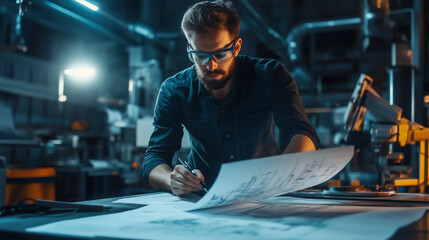 focused engineer examines blueprints in factory, wearing safety gear and hard hat. machinery glows, highlighting intricate details of equipment