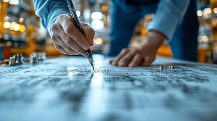 Precision Engineering in Progress: An engineer meticulously reviews and annotates complex blueprints in a bustling workshop, highlighting the intricate details of industrial design.
