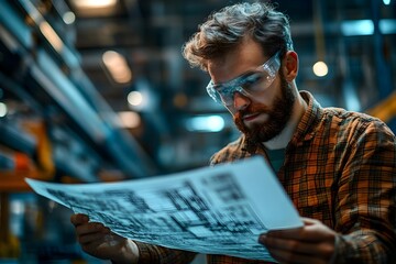 Focused Engineer Analyzing Technical Blueprints In Workshop Images