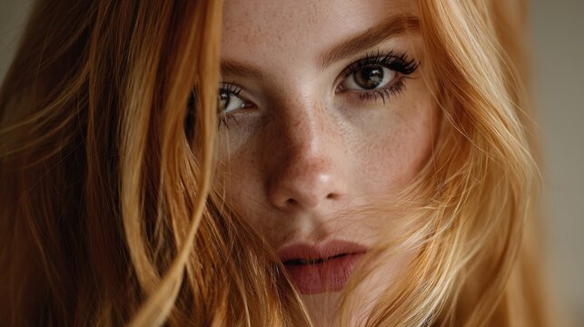 A young woman stands in a bright indoor setting. She has long red hair that frames her face. Her eyes are focused on the viewer. Light highlights her features.