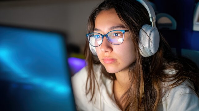 A female engineer in glasses is focused on a computer screen, working on nighttime cybersecurity maintenance and networking in a data center.