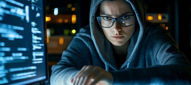 Focused female hacker wearing headphones working at computer in dark room. Concept of cybersecurity, coding, data protection and digital privacy