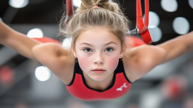 Determined young gymnast girl training on gymnastic rings, showcasing strength and focus during practice