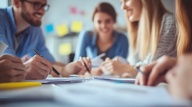 Close-up of a Person's Hand Writing on Paper with Others Blurred in Background