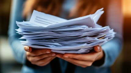 A person is gripping a substantial stack of documents, conveying a sense of urgency or completion in a relaxed environment during the late afternoon