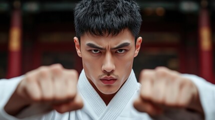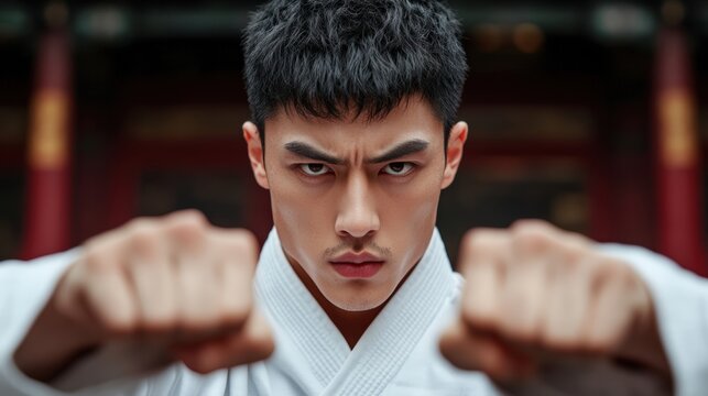 Determined karate practitioner in white gi demonstrating fighting stance with intense concentration. His powerful posture and focused expression showcase discipline and combat readiness in a tradition