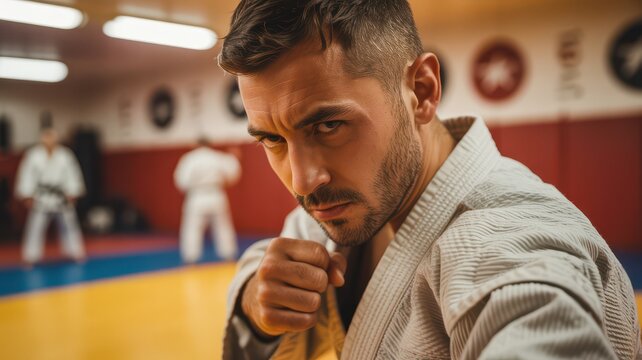 A seasoned martial artist demonstrates karate skills in a dojo, focused and poised to strike