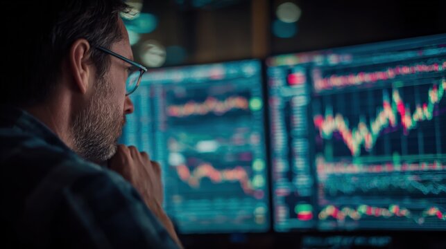A man focused on multiple computer screens displaying financial data. He's working late into the night, analyzing market trends and strategizing investments.