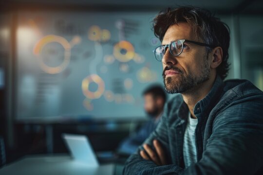 Thoughtful businessman analyzing complex strategy on digital whiteboard in modern workspace, deep focus on innovative solutions and data-driven decision-making enhancing leadership corporate vision.