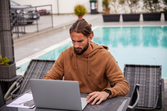 young athletic guy, in smart working mode, is busy with his laptop with focus and dedication, while sitting on the table in his home garden with swimming pool