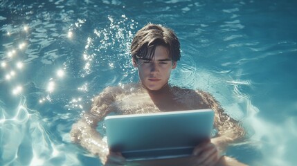 Young man using laptop while relaxing in swimming pool, sunlight reflecting on water, casual and modern lifestyle