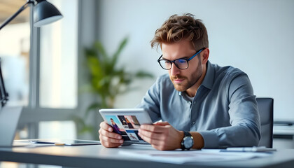 Focused Young Businessman Using Tablet Computer in Modern Office Workspace Reviewing Digital Documents or Project Collaboration  - Professional Man Working Remotely on Technology Device
