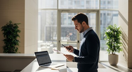 A focused businessman reviews documents and uses his phone while working remotely in a modern building.