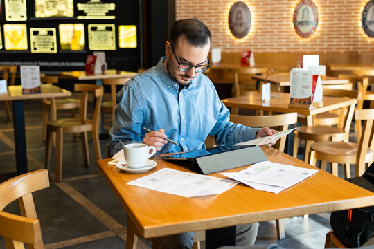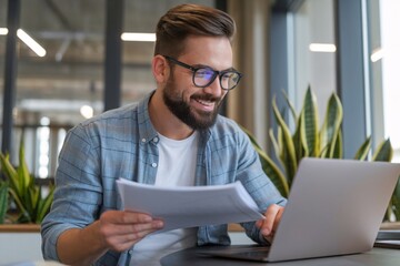 A young bearded brunette man sits at a table in front of a laptop, holding papers in his hands. He works remotely, checking information and creating graphics for a digital project.