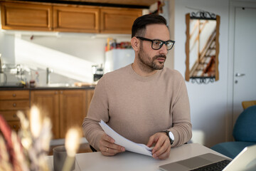 Worried man reviewing documents at home while working remotely on a laptop, reflecting stress or financial concerns.