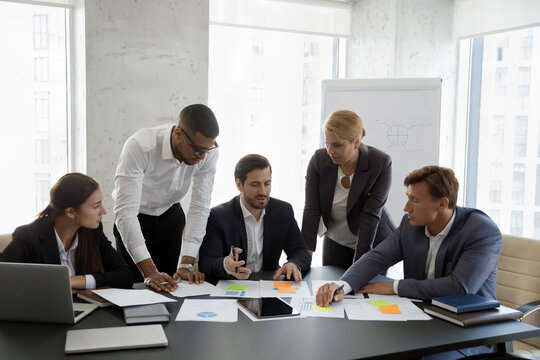 Group of focused young serious multiracial colleagues analyzing financial paper documents or marketing research results, discussing corporate growth strategy or briefing project ideas in modern office
