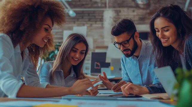 Collaborative team analyzing project in modern office space