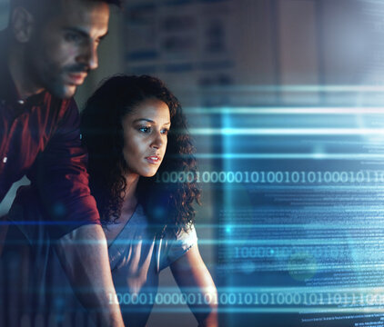 Two focused individuals, a man and a woman, immersed in a digital task with code overlays, symbolizing technology, programming, or cybersecurity.