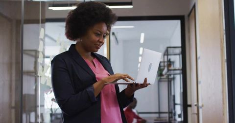 Focused professional typing on laptop in modern workplace