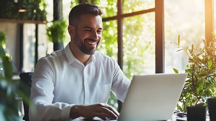 Happy professional using laptop in bright office space
