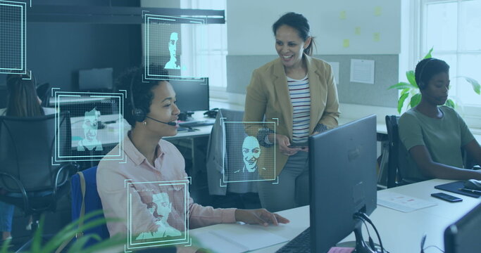 Female office worker wearing headset using keyboard and mouse at desk near window with monitor