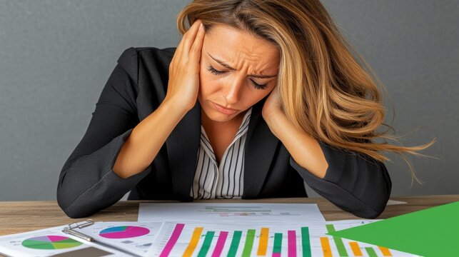 A stressed businesswoman encounters difficulties while analyzing graphs and reports, reflecting the challenges of the corporate world.