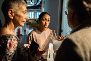 Two Asian business woman are discussing business reports and analyzing data at a desk. One is using a tablet while the other gestures. They appear focused,exchanging ideas in a modern office setting