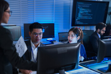 A female project manager leads a late-night review with her diverse team, discussing a report and analyzing data on computer screens to ensure they meet a critical deadline.