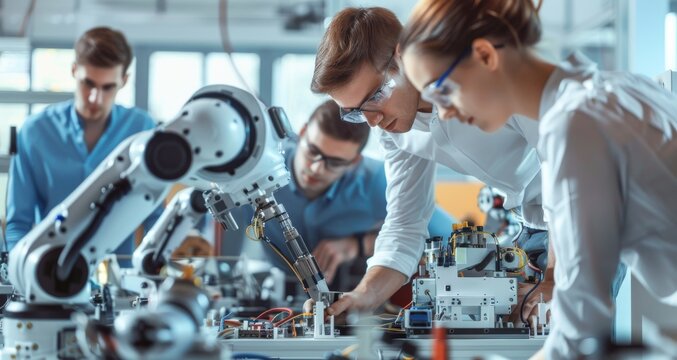 Team of engineers working on robotics project in modern lab, developing innovative technology