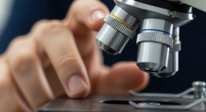 Close-up of a microscope with hand adjusting focus on biology slides. Symbol of science, discovery, and education in a modern learning environment