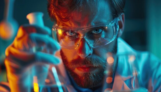 Focused Scientist Analyzing Lab Flask For Research Images