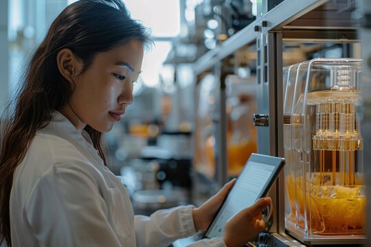 In a modern laboratory setting, a woman wearing a lab coat observes a bioreactor filled with orange liquid while taking notes on a tablet. She focuses intently on her work