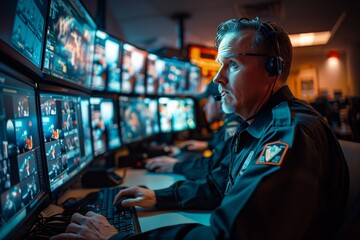 Man wearing headset monitors multiple screens in a control center, focused on data analysis and security