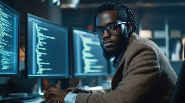 Focused programmer working on multiple computer screens filled with code, analyzing data in a modern technology environment.