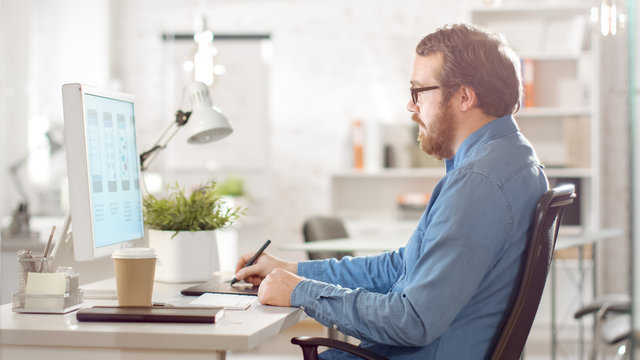 Young Bearded Man Working on His Personal Computer and Taking Notes while Sitting in Bright Modern Creative Agency Office.