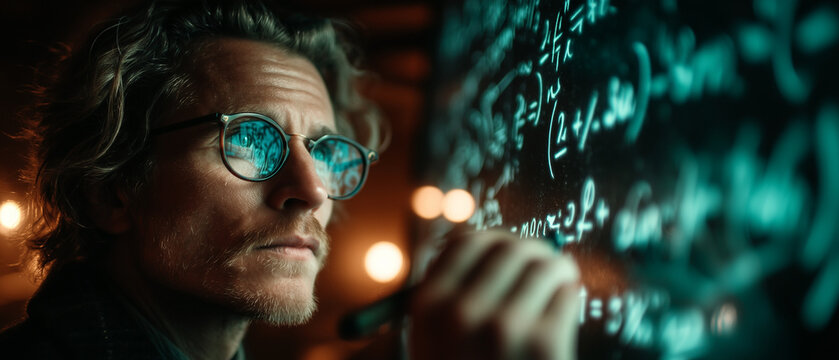 Mathematician solving complex equations on a chalkboard filled with elegant symbols and diagrams.