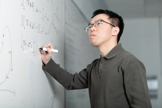 A Chinese college student wearing glasses writes mathematical equations on a whiteboard with a marker. He appears focused while working through a complex math problem in a classroom setting.