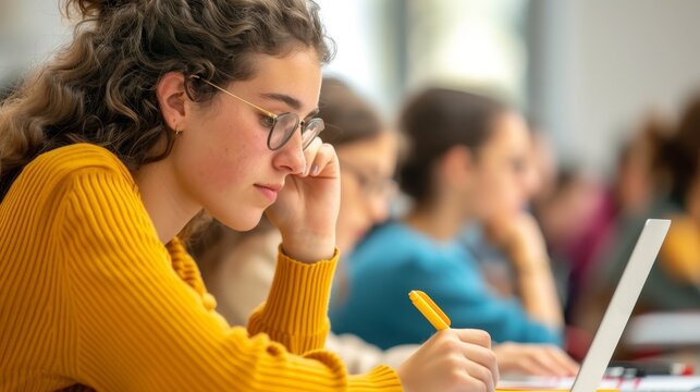 focused student taking notes in a classroom setting - academic learning and concentration