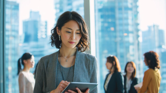Asian female young professional using tablet in modern office with colleagues