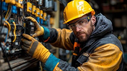 A technician in safety glasses and gloves is engaged in electrical repairs inside a commercial building. He is concentrated on fixing complex wiring and equipment