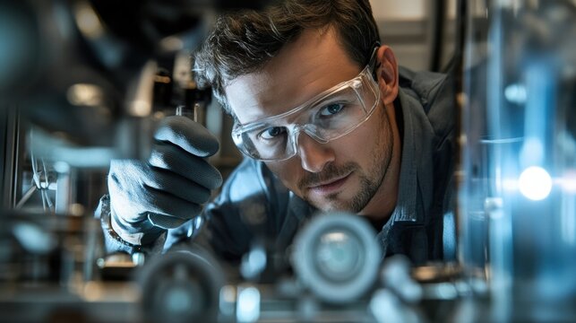 Industrial engineer wearing safety glasses and gloves carefully working on complex machinery in modern manufacturing plant, showcasing precision and expertise in industrial environment