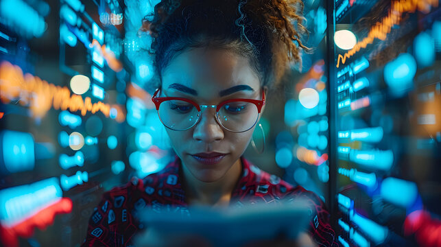A focused woman engages with data on an illuminated digital screen, embodying expertise and concentration in a dark, modern environment with futuristic elements.