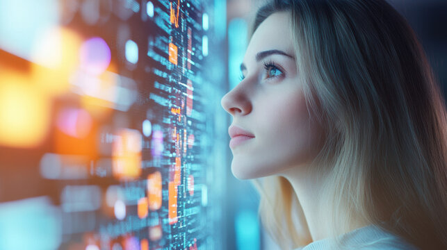 focused woman analyzing digital data on futuristic interface, surrounded by glowing holographic elements, symbolizing technology, innovation, and data driven insights